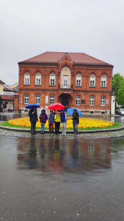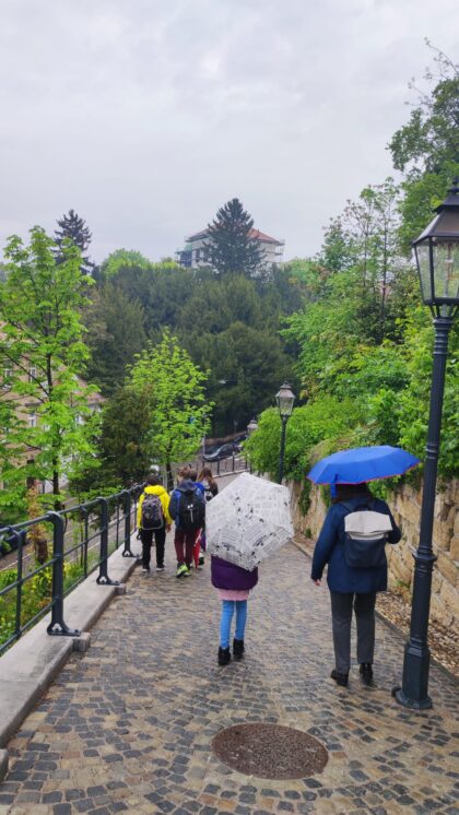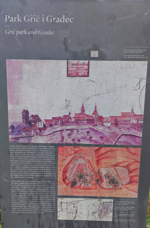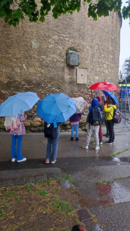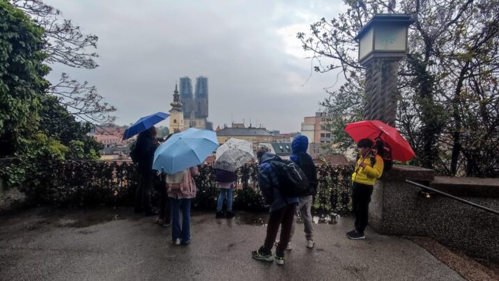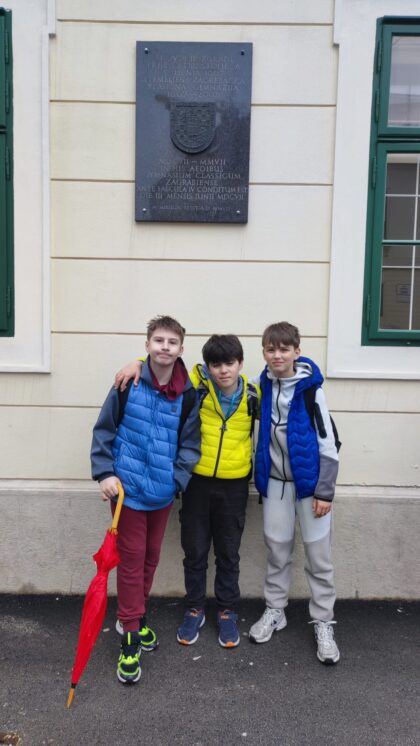 mjestu gdje je ranije bila kuća bogatog trgovca Pavla Hatza. Pogledali su i novčić cara Dioklecijana (iskovan god. 299.), zamišljajući da je nekom nepažljivom stanovniku Carstva slučajno ispao iz vrećice za novac. Na sjevernoj kaptolskoj kuli proučili su nadgrobni natpis Akonije Salvije (1. st.), uspoređujući originalan latinski tekst i prijevod. Zatim su krenuli do prve zgrade Klasične gimnazije, koju su 1607. osnovali isusovci. Danas je to sjedište Gornjogradske gimnazije. Isusovci su podigli i dom za siromašne učenike i studente (danas Gimnazija Tituša Brezovačkog) te postavili temelje Sveučilišta i Nacionalne knjižnice.